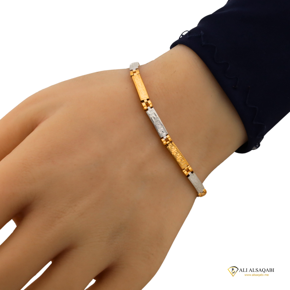 • اللون الذهبي الممزوج بالأبيض يمنح الاسوارة بعدا بصريا جذابا يناسب جميع ألوان البشرة