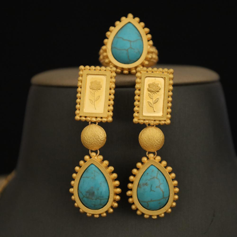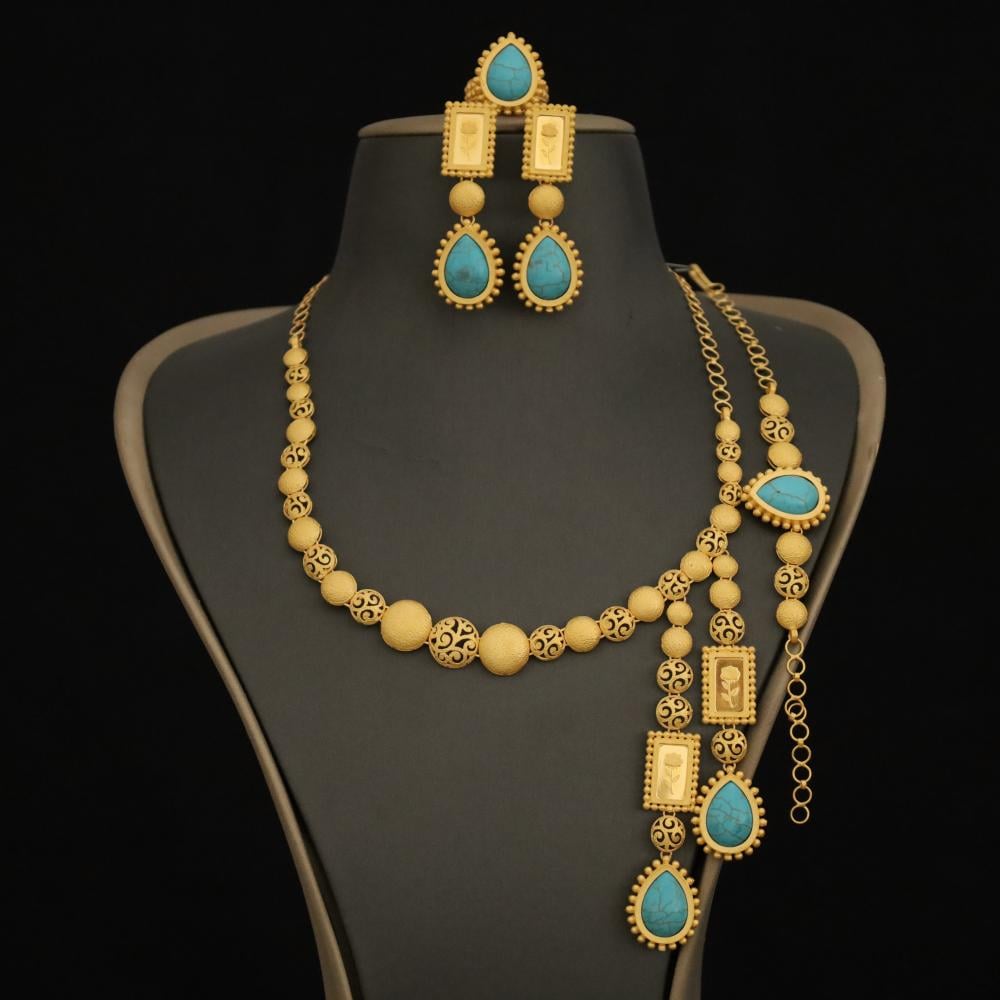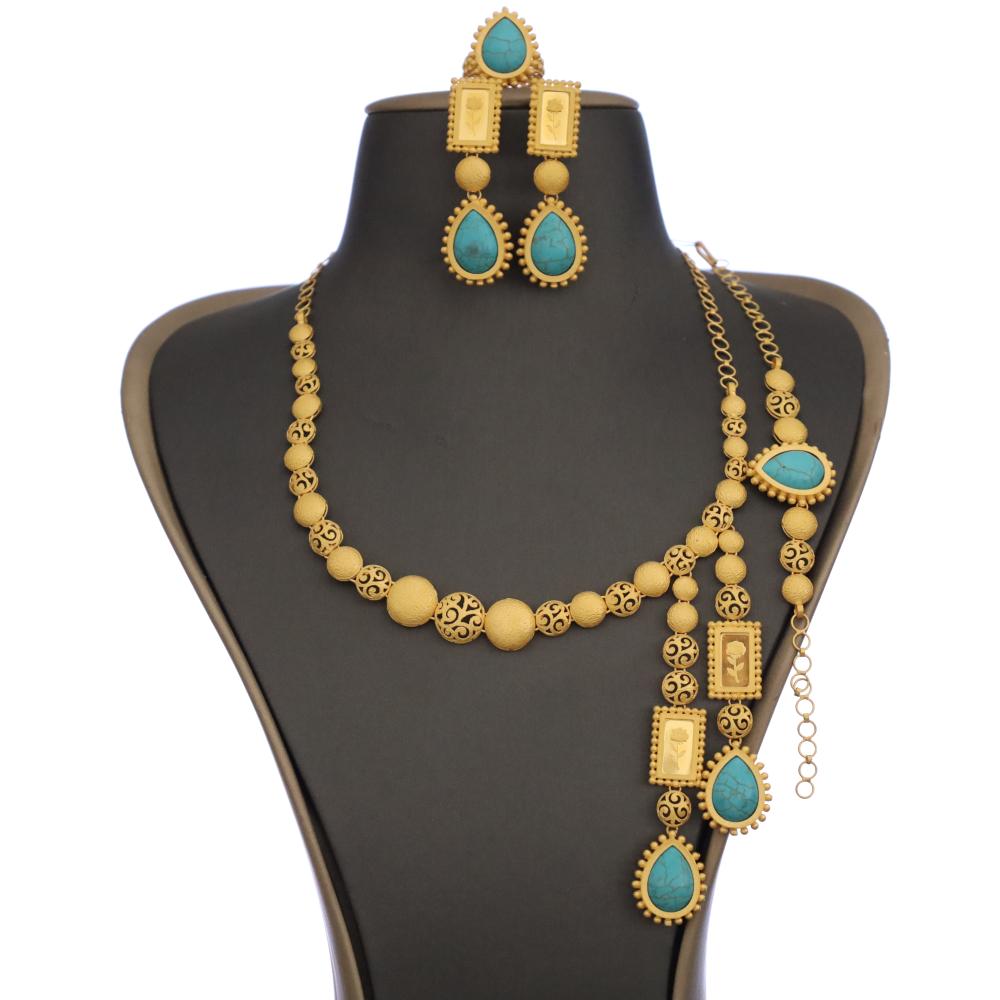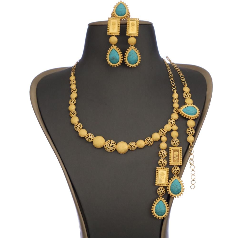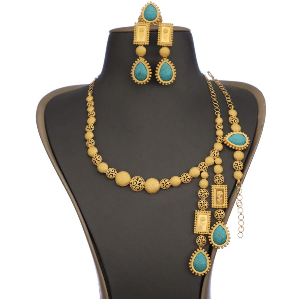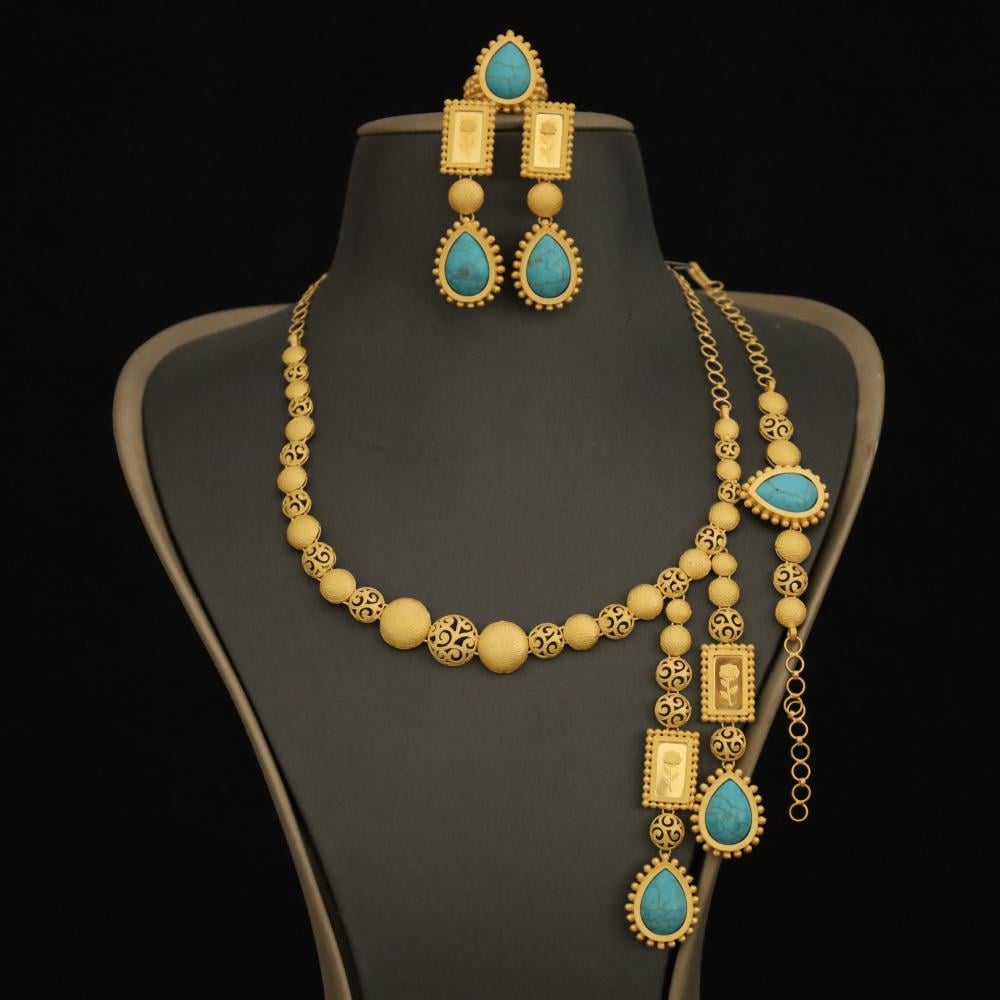 - طقم ذهب صافي بعيار 21 مزين بالاحجار الكريمة من العقيق والسبائك النقية بعيار 24 من الذهب النقي